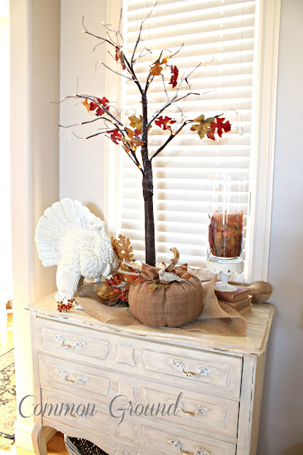 I want to share a few Thanksgiving pieces that I've used for years. They may rotate from room to room, within different vignettes, but they always seem to show up each year to help celebrate. I put together this woodsy urn a few years ago using grapevine twigs, Fall leaves, berries, pine cones, deer-shed antlers and a variety of fine feathered friends.